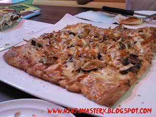 This rectangular shaped pizza comes neatly pre-sliced. The medium crust is complemented nicely with mushrooms, shredded chicken, cheese and teriyaki sauce.