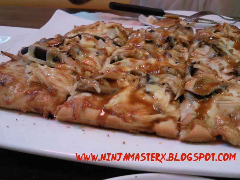 This rectangular shaped pizza comes neatly pre-sliced. The medium crust is complemented nicely with mushrooms, shredded chicken, cheese and teriyaki sauce.